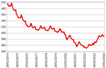 - i prezzi medi sono inferiori al periodo pre-pandemico (406 euro a febbraio 2019);