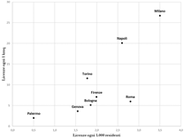 Fonte: elaborazioni AGCM su dati forniti dai comuni di Bologna, Firenze, Genova, Milano, Napoli, Palermo, Roma e Torino e su dati Istat