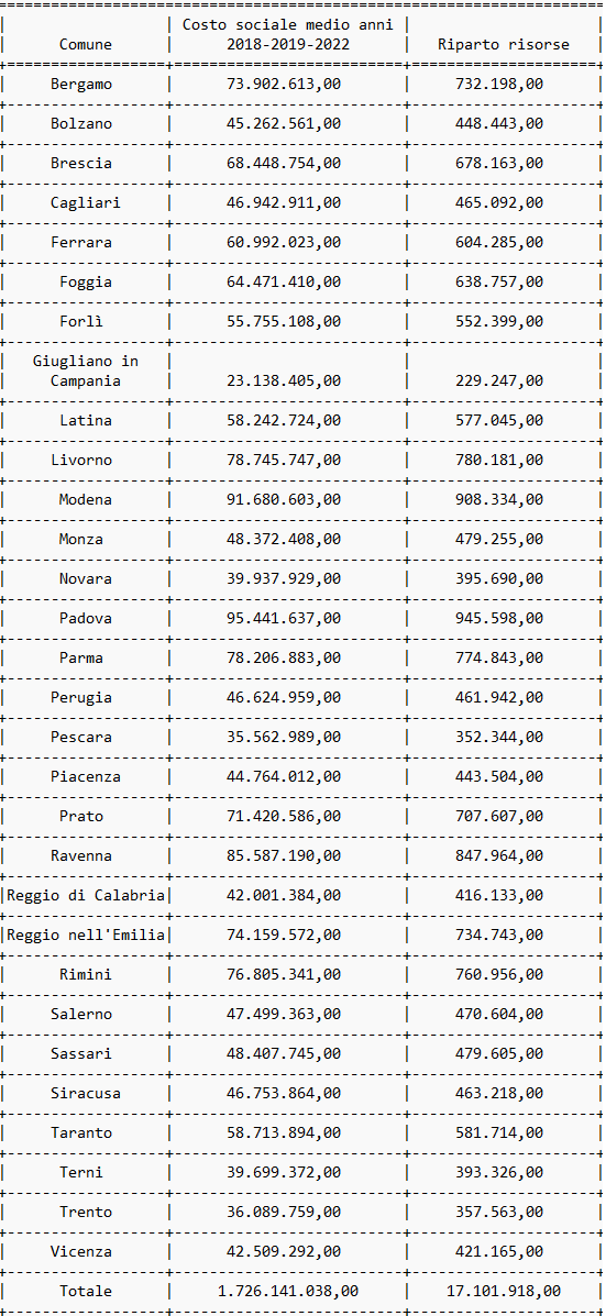 Ritenuto opportuno suddividere tale somma tra detti comuni assegnando a ciascuno una quota calcolata in proporzione al costo sociale dei morti, feriti e di un incidente riportati nel report annuale ISTAT sugli incidenti stradali con feriti per gli anni 2018, 2019 e 2022;